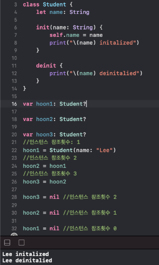 - 함수 내부에 Student타입의 인스턴스를 이니셜 라이저로 생성 후 hoon상수에 할당할 때 인스턴스 참조 횟수가 1이 되고 지역변수인 hoon이 사용된 블록( { , } )의 코드 실행이 종료되면 인스턴스 참조가 0이 되어 deinit을 호출을 합니다.