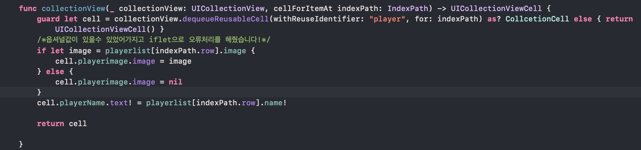 - 사진은 없어도 선수 이름은 있어야겠죠? 그래서 playerName은 강제 언래핑으로 해줬습니다.